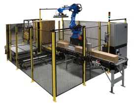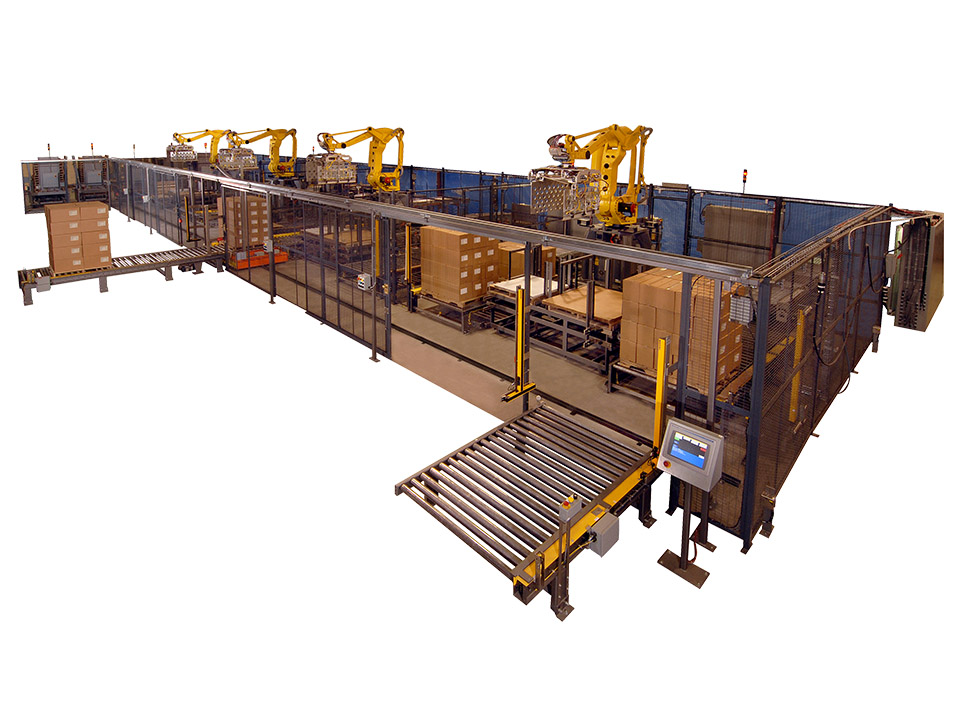 Wrapped pallets are then discharged to a staging conveyor for pick-up. For operator safety, a fully interlocked guard system is provided that immediately stops the robot if a perimeter door is opened.