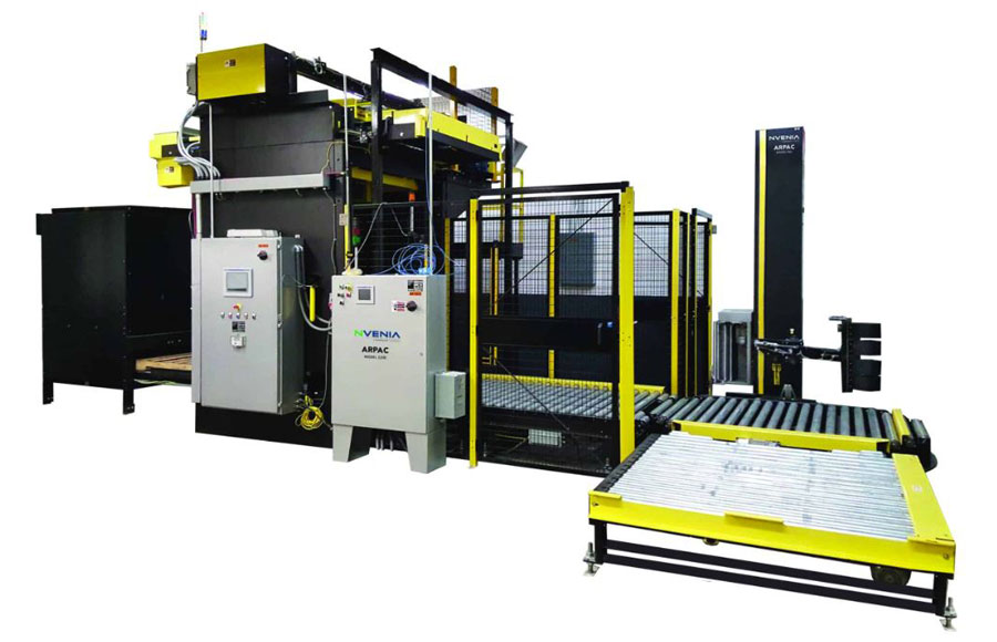 Our Arpac Brand Robotic Palletizer Model is a pre-engineered robotic palletizing cell that automatically stacks and wraps pallets to exact specifications.